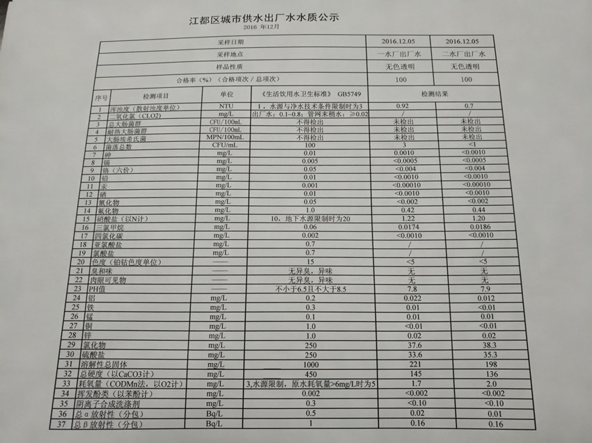 2016年12月江都區城市供水出廠水水質公示