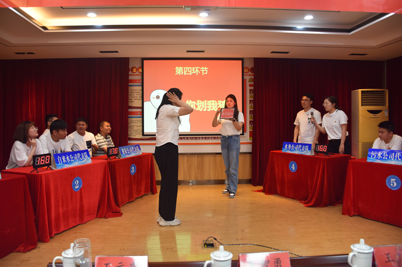 此次比賽分為小組共答題、個人必答題、搶答題、你劃我猜、風險題五種形式,并分五輪進行。共有五支代表隊參賽,分別是惠民、自來水、龍泉、水務、污水公司代表隊,且每個代表隊人員都是經過層層篩選脫穎而出的。大家顯然是有備而來的,競賽過程精彩激烈,參賽選手們有的運籌帷幄、有的胸有成竹、有的應對自如,各代表隊你追我趕、搶答器的聲音此起彼伏,現場戰況異常激烈,展示出了新時代水務公司團員青年的風采。
