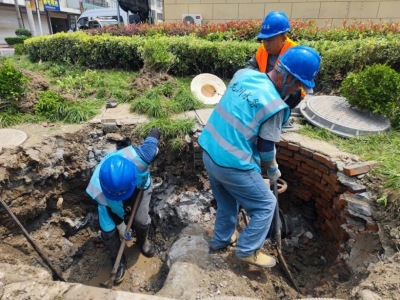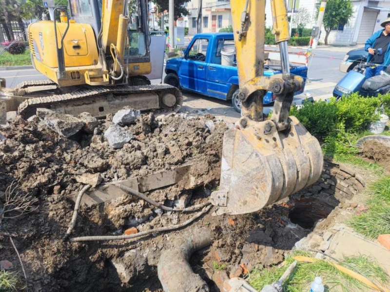 此次維修的是老水廠鋪設的DN200的PVC管道,但在施工過程中遇到了較多困難,當挖掘機破開路面時,發現需要破除80公分左右厚度的混凝土,但中間是DN300的鋼管,漏點卻在鋼管下方的PVC管與球管連接處,這無疑給施工增加了很大的難度。挖掘機施工時,稍有不慎就會破壞中間鋼管,只能通過手動一邊用風鎬、洋鎬等進行破碎,一邊用鐵鍬進行開挖,同時還需要抽水作業。由于當天室外氣溫高達34攝氏度,烈陽高照,汗水早已浸濕了現場施工人員的衣服,但他們不怕苦、不怕累,克服各種困難,通過3個小時不間斷地搶修,最終完成這段老舊管道的維修更換。